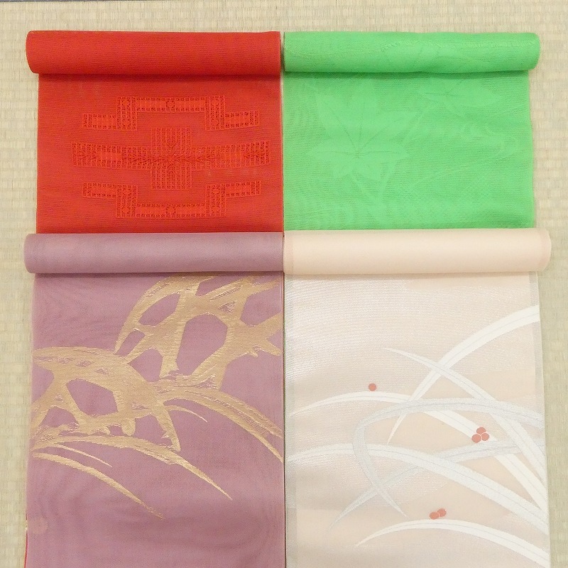 - 2405A-2113●丸文/名古屋帯○4点/西陣織/夏物/花柄等/リメイク・材料等に/新品/未仕立て/正絹/(梱包サイズ:80)