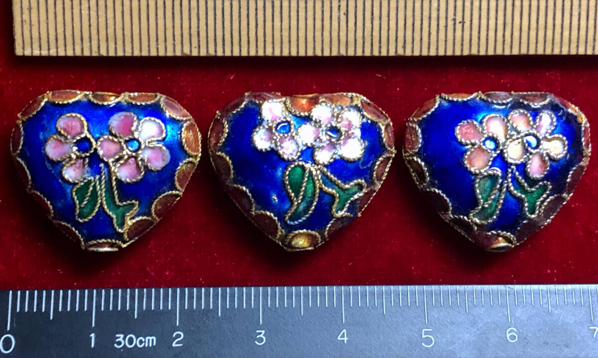 > ¶!¶ 有線七宝焼ワールド - 3個の大ハート型ペンダント ¶!¶ 厚10㎜×横22㎜×縦19㎜ 金線に深藍釉ピンク花芯 手作 手芸 工芸 インテリア