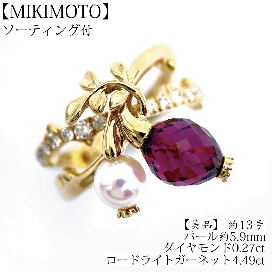 - 美品 MIKIMOTO ミキモト ロードライトガーネット4.49ct パール約5.9mm ダイヤ0.27ct リング K18 ゴールド 希少 金 ソーティング付き