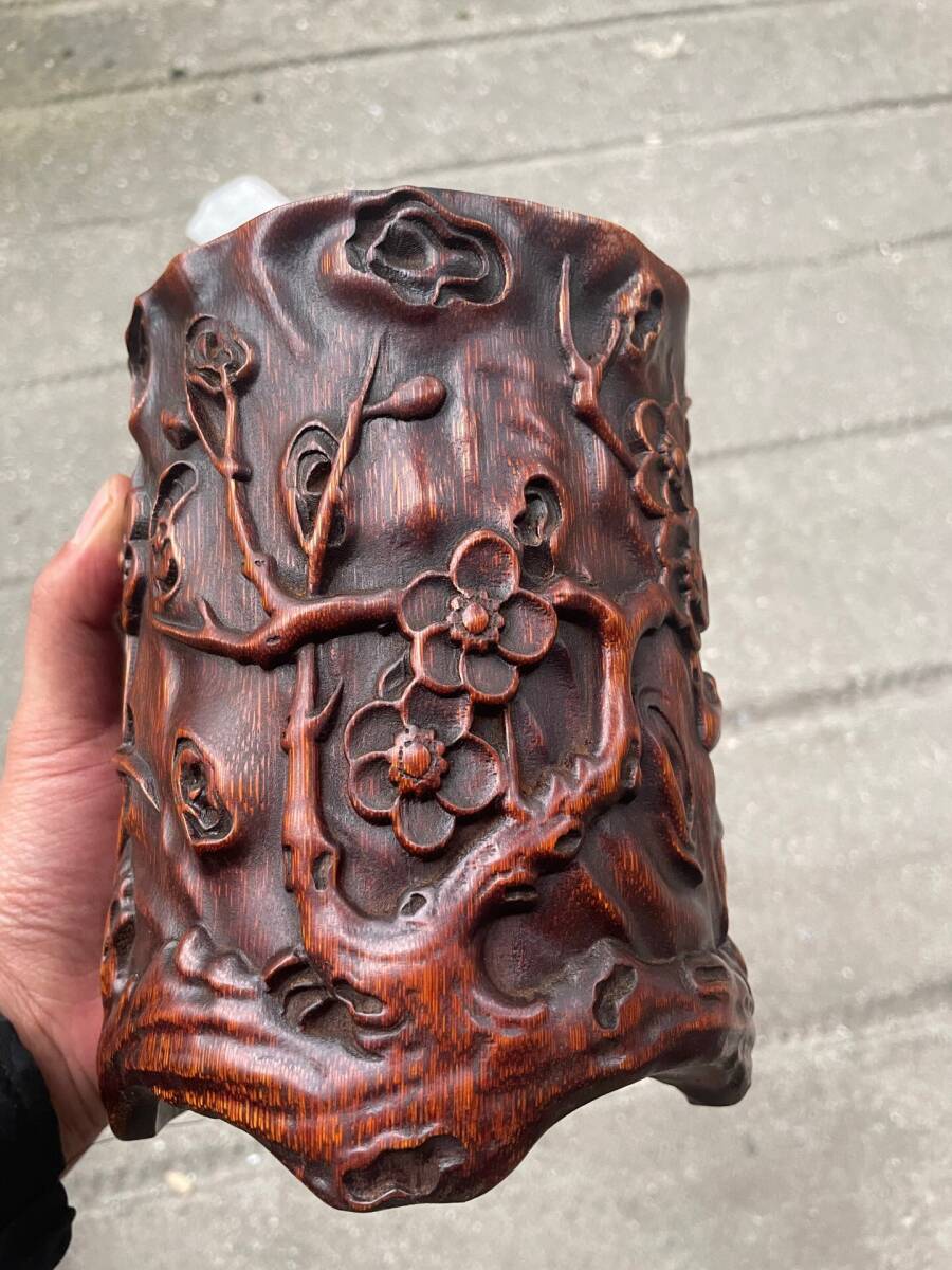 - 蔵友旧蔵出 竹材製 細密彫 梅花紋 文房筆筒 文房具 供養品 置物擺件 稀少珍藏品 古賞物 中国古玩 中国古美術品