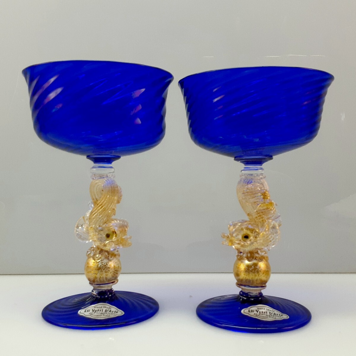 - 【MURANO】ITALY★ムラノ 金彩 ドルフィン モチーフ ブルー グラス 2客セット★ヴェネチアン グラス ムラーノ 島 ベネチアン ガラス