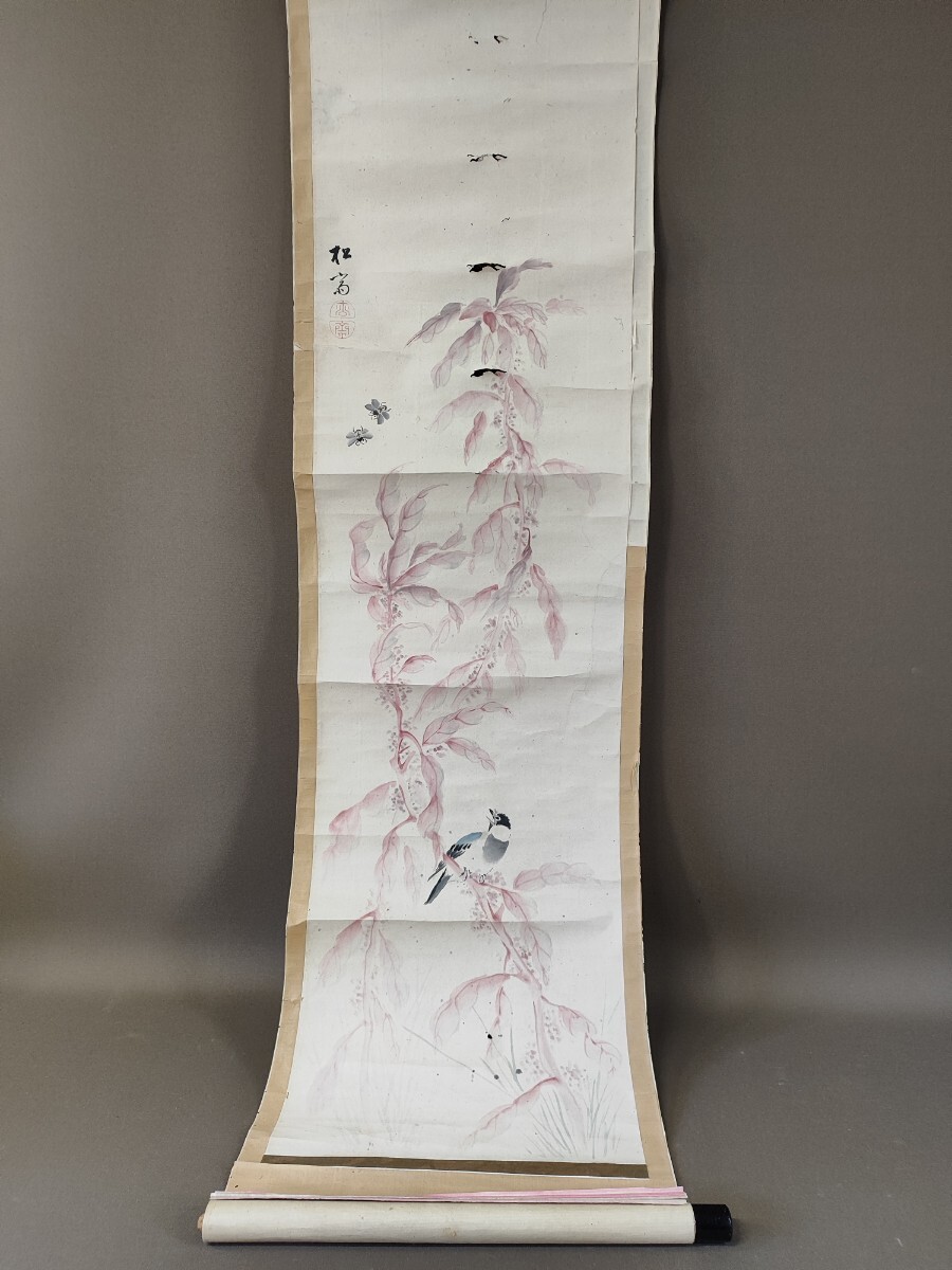 - k126 【作者不詳】花鳥図 穴あき 古美術 骨董品 時代物 紙本 掛軸 中国美術 模写