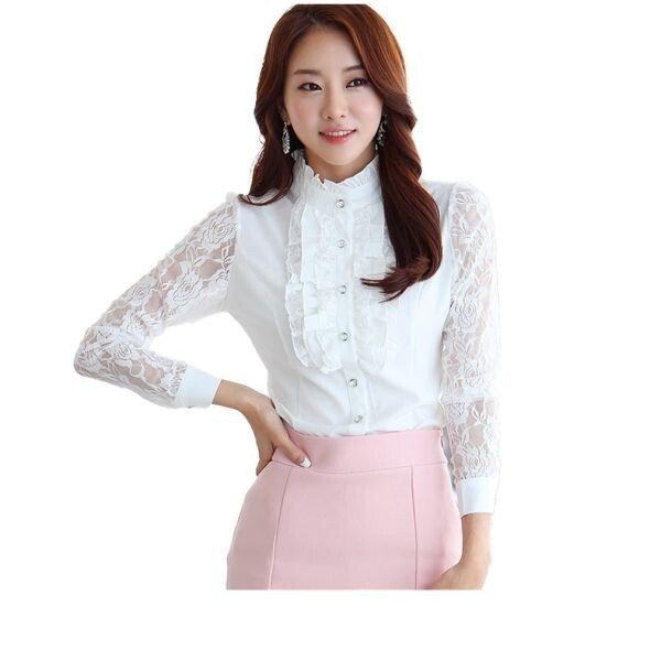 - ホワイトシャツ レース付き レース付き袖 ロングスリーブ 胸元フリル インナー OL レディース 2XLサイズ ホワイト