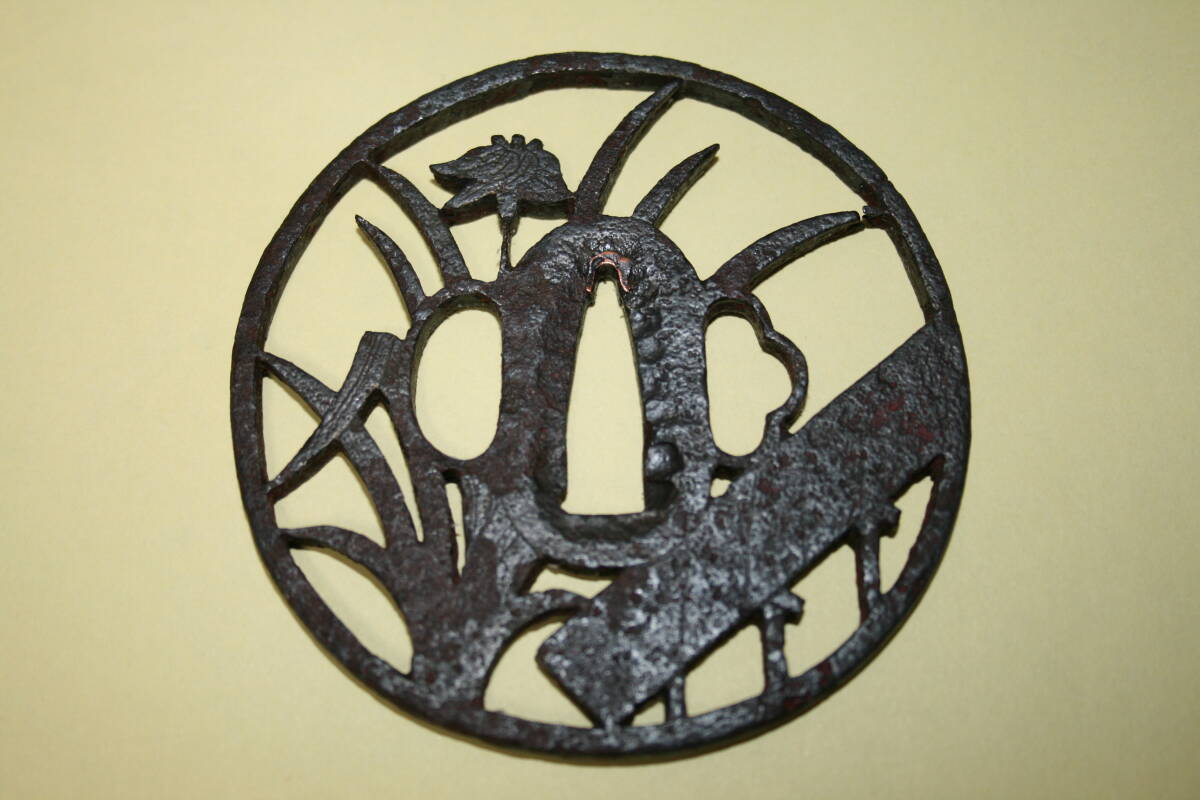 - ▽美▽ ★ 優品 ★ 古赤坂鍔 鉄地 丸形 八ツ橋かきつばた透かし 無銘 (オ)☆ 時代物 江戸初 刀 脇差 鍔 忠正 【売切れ御免 / 遺品整理 】