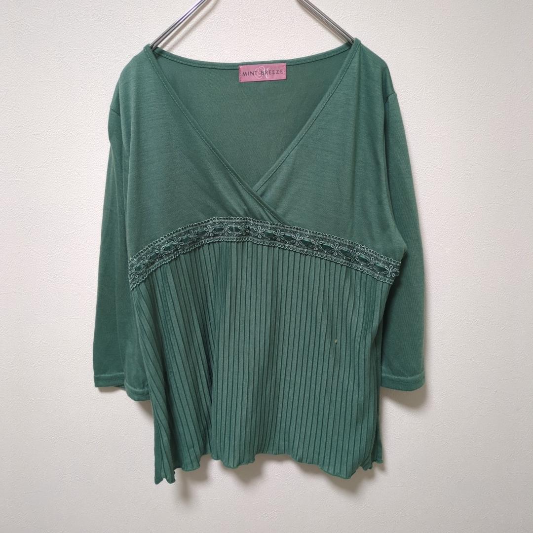 - 【美品】ミントブリーズ(ONE)Vネックカットソー*プリーツ*七分袖*グリーン