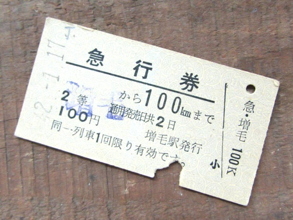 > 切符 A型硬券 急行券 2等 昭和42年 増毛~100kmまで 増毛駅発行 100円 国鉄 北海道 レトロ 24