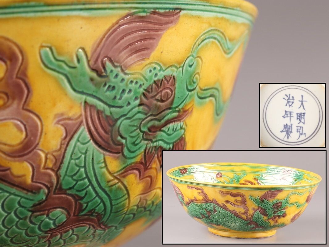 - 中国古玩 唐物 大明弘治年製 款 黄交趾 鉢 時代物 極上品 初だし品 D4529