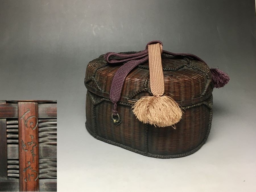 ■個人コレクション出品■島村白峰斎 竹編茶籠 合せ箱 仕覆付 内布張 茶道具 竹工芸 渋さ際立つ作品!!