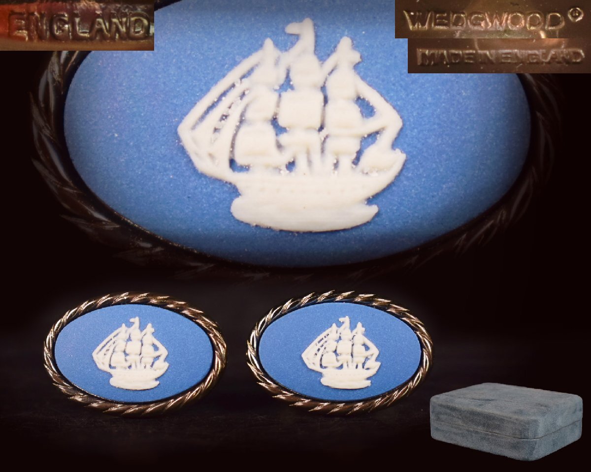 Z315 【泉美】MADE IN ENGLAND WEDGWOOD ウェッジウッド ブルー 帆船 カフスボタン 装身具 アクセサリー ケース入