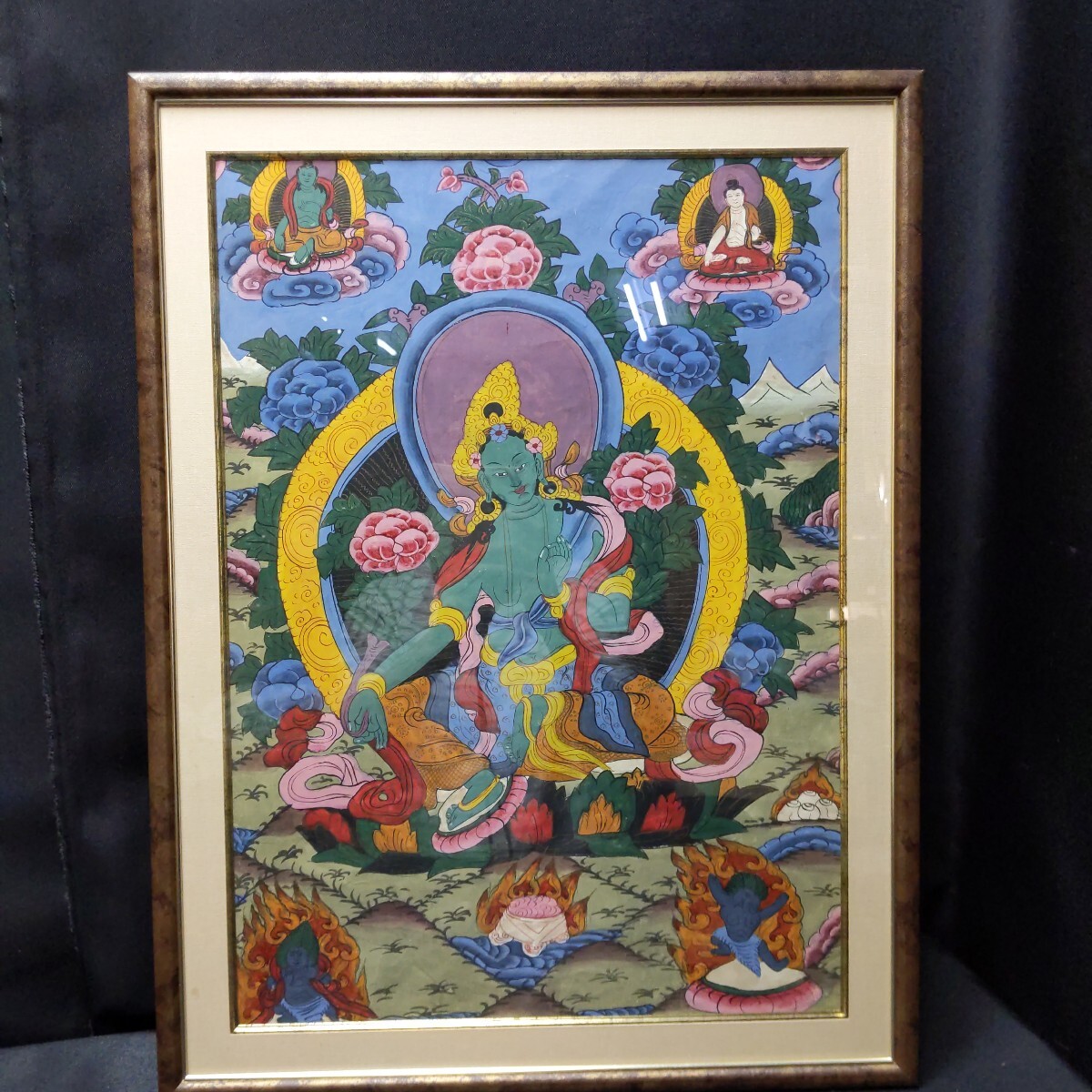 - チベットタンカ 密教仏画 緑曼荼羅 布地 本金彩色絵 額装 唐 百度母 ネパール グリーンターラ菩薩 縁起物 壁掛け 仏教美術品 緻密画 838