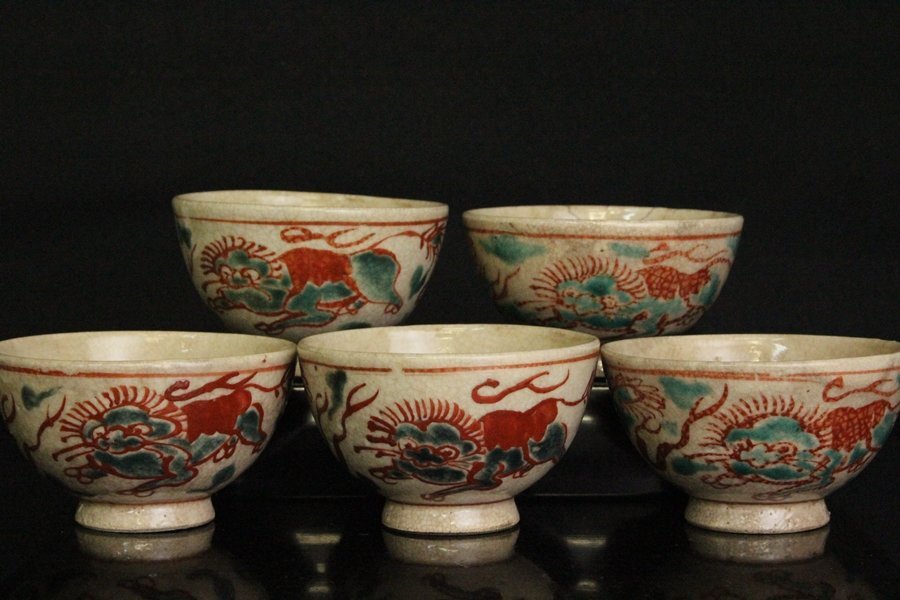 - TB526煎茶碗 5客◇うぶだし/直し有/赤絵/呉須/明治/唐獅子/古玩/湯呑/煎茶道具/煎茶器/古陶磁/工芸/時代/骨董/古美術/古道具タグボート