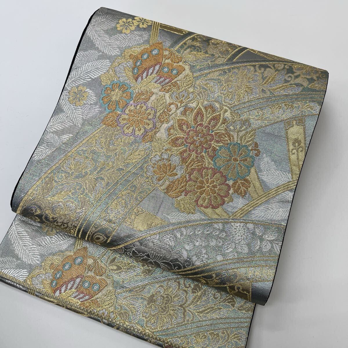 - 袋帯 ラメ糸 煌びやか 雪輪に蝶 草花 正絹 W-4478