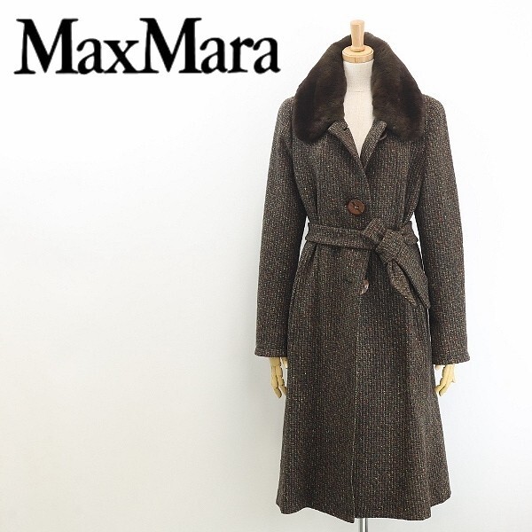 > 【HA473】◆Max Mara マックスマーラ ミックスツイード 衿シェアードミンクファー リボンベルト付 コート 42