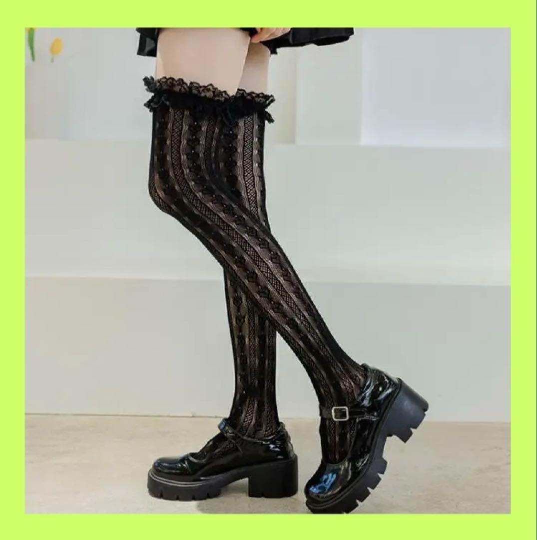 - 新品 ニーハイソックス 靴下 ハイソックス フリル フリルソックス 透け ロリータ メイド ゴスロリ 仮装 ハロウィン ブラック 黒