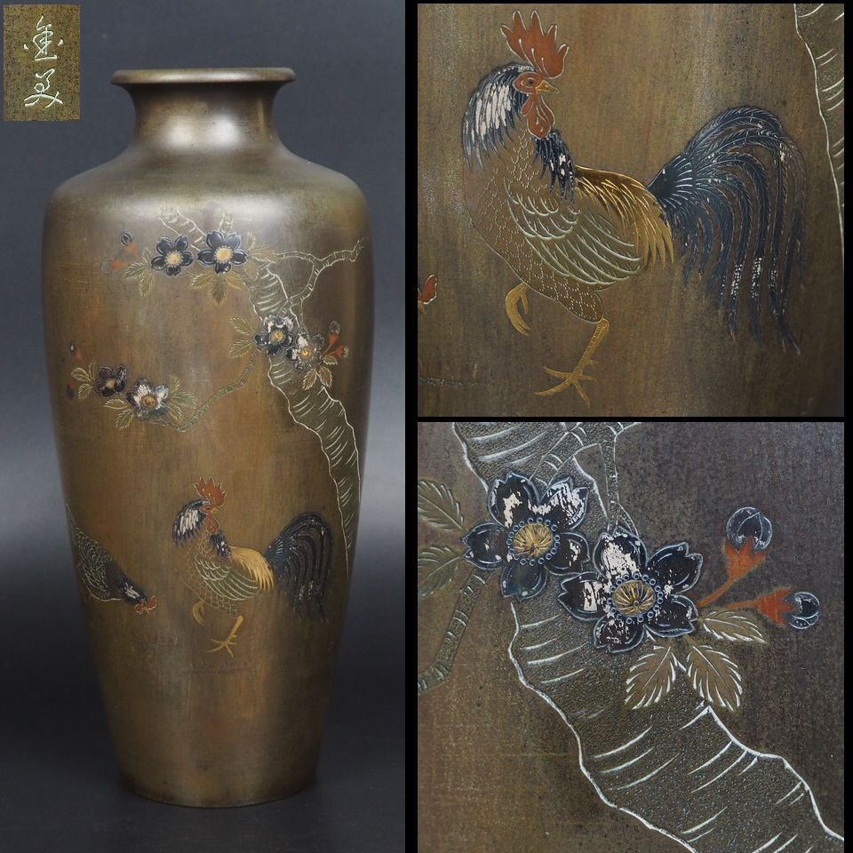 - 【金富士】値下げ中 幕末~明治期 金銀象嵌銅製花瓶 在銘 高さ24cm 検/銀瓶鉄瓶茶托茶壺古錫玉川堂高岡佐渡銅器龍文堂