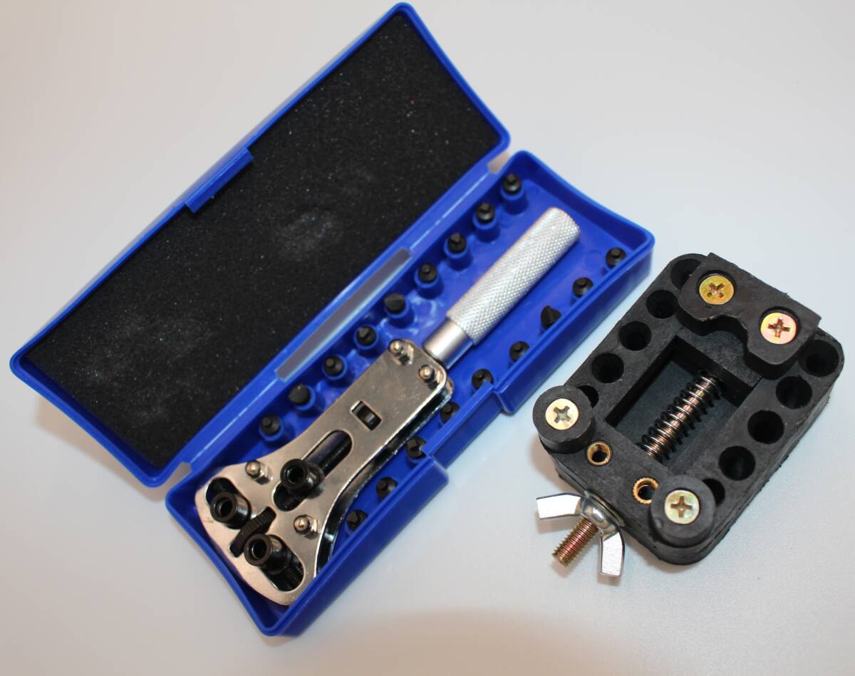 - 3点支持オープナー+時計固定台 防水式腕時計用 スクリューバック 18ビット 電池交換 裏蓋開閉工具 爪幅調整式 カバーケース付 修理ツール