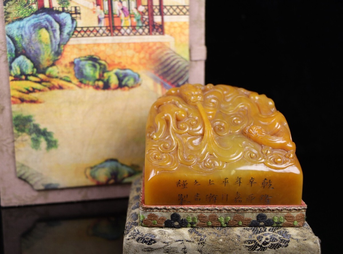 - 「清 乾隆辛卯年嘉平月上澣之吉謹製 老寿山石 田黄石彫り 魑龍吐瑞 印章」極細工 擺件 古賞物 中国古美術 旧蔵出