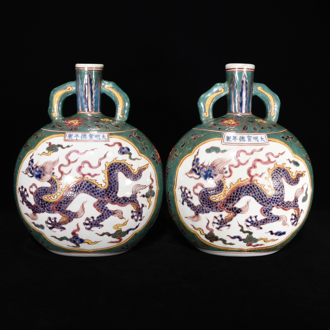 - 『館蔵珍品 明 宣徳年製款 古陶瓷品 五彩 龍紋 如意耳扁瓶 陶芸』稀少珍蔵品 古賞物 貴重物品 収蔵品 中国古美術 時代物 古董品