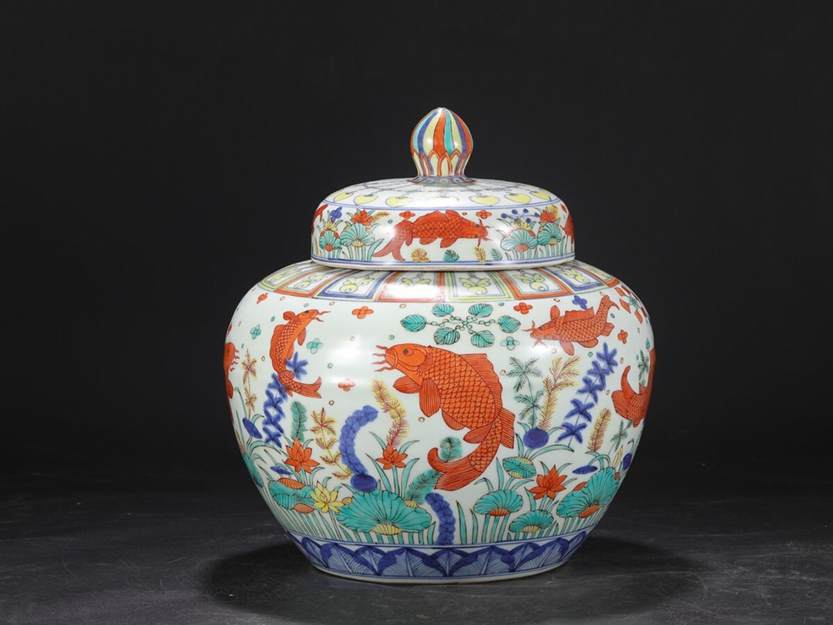 - 「明 嘉靖年製 陶磁器 青花五彩魚藻紋 大蓋罐」染付 置物 擺件 古賞物 中国古美術 旧蔵出