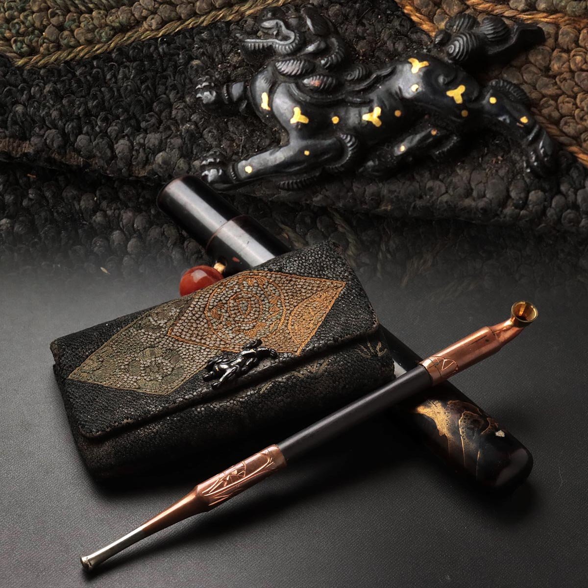 - EL642 時代提げ物 四分一金象嵌前金具/銀裏座 相良刺繍莨入 / 瑪瑙緒締 / 蒔絵煙管筒 / 四角金銀銅煙管 古煙草入一式・喫煙具 明治金工
