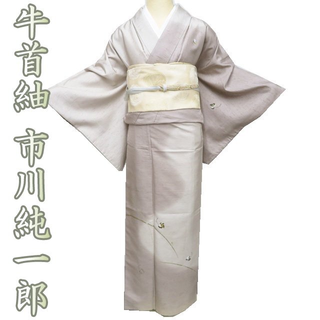 > 特選 牛首紬 着物 中古 袷 紋付き 金駒刺繍 白山工房 市川純一郎 落款 植物文様 砂色 多色 金 身丈164cm 裄67cm L きもの北條 A1277-10