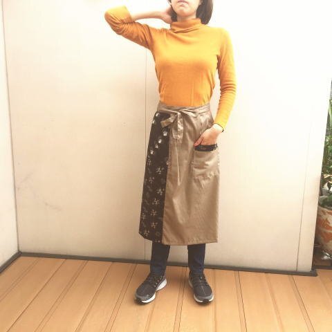 - 着物素材使用1600円カーキに絣文ポケット付きロングエプロン