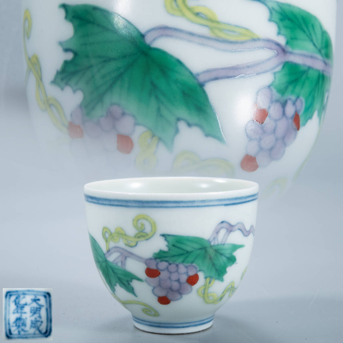 - BR2770-中国美術 大明成化年製 色絵 豆彩 花卉葡萄文茶碗・煎茶碗・煎茶道具・唐物 径5.5cm高4.2cm