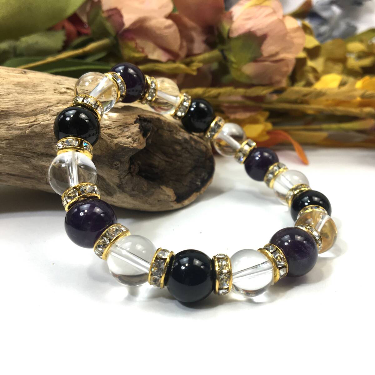 > アメジスト×水晶×オニキス パワーストーン ブレスレット 天然石ブレス (ロンデル: ゴールド) 10mm メンズ・レディース