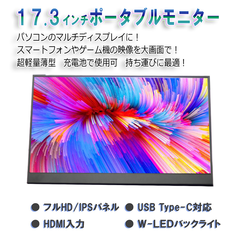 - 高解像度 フルハイビジョン 17.3インチポータブルモニター HDMI USB Type C イヤホン端子 スピーカー内蔵 IPS 軽量マルチモニター[KT13
