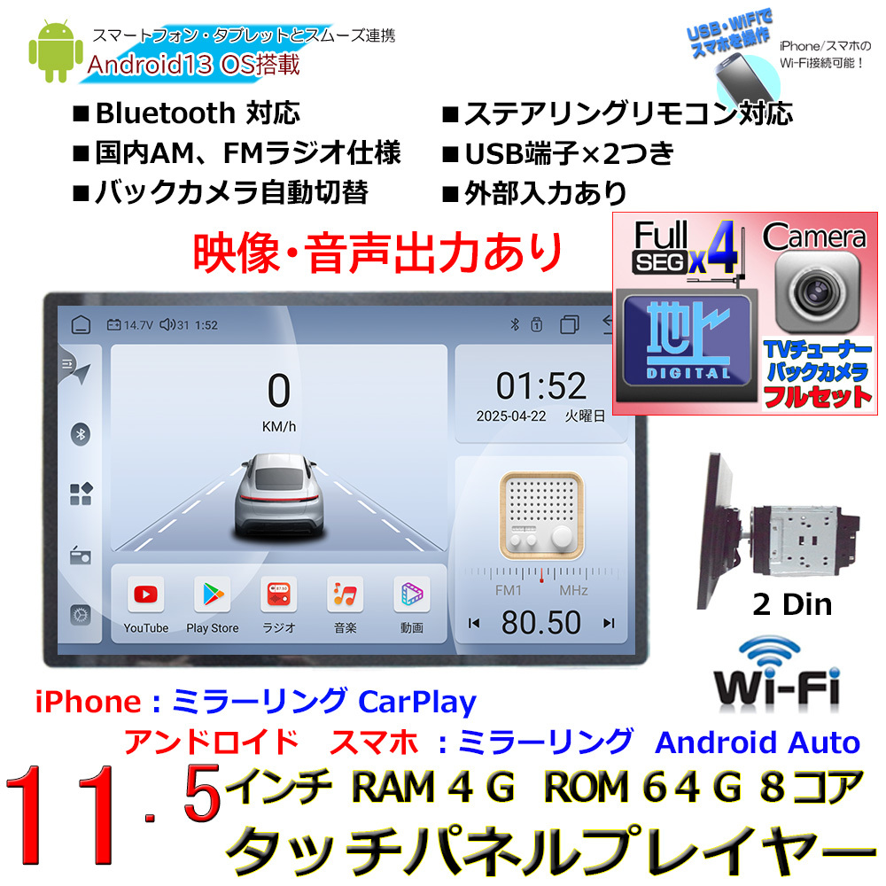 - 2DIN11.5インチタッチパネルフルハイビジョンAndroid13 RAM4G ROM64G Carplay android auto 地デジチューナーセット バックカメラ