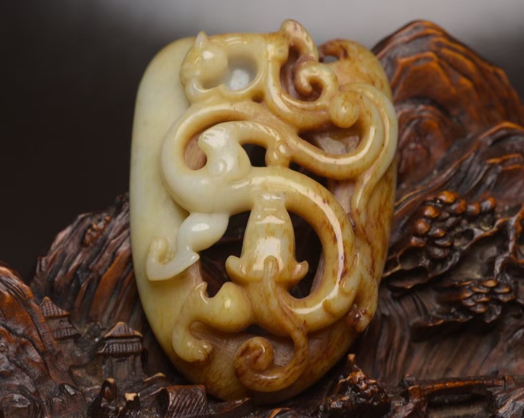- 『館蔵珍品 和田玉製 細密彫 與龍鳳佩 置物 賞物』文房具 書道品 貴重物品 収蔵品 中国古美術 時代物 古董品