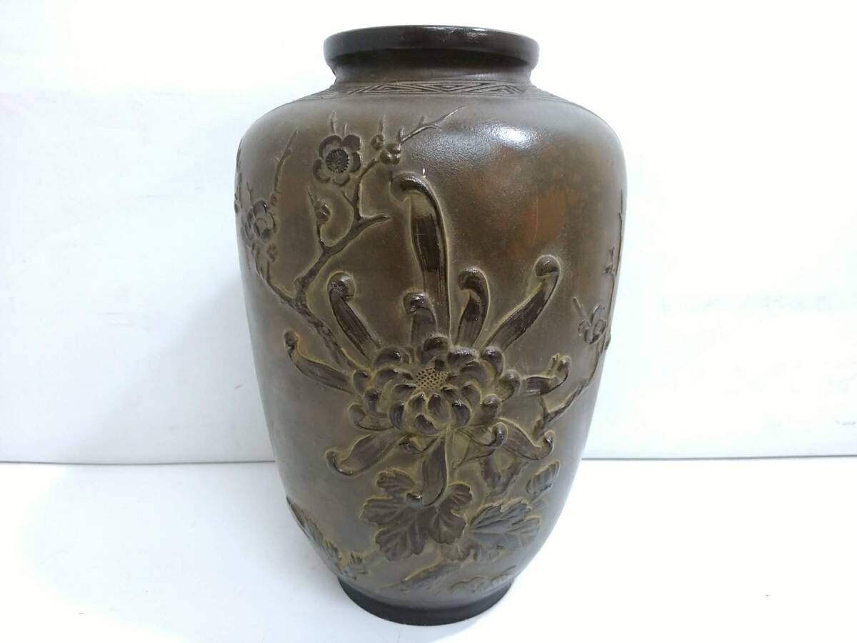 - 【うぶだし】金属製 花鳥文 花瓶/高さ約30cm/重量約2.6kg/四君子/金属工芸/花器/花入/花生/飾壺/飾り壷/床の間飾り/茶道具/8-RHB81