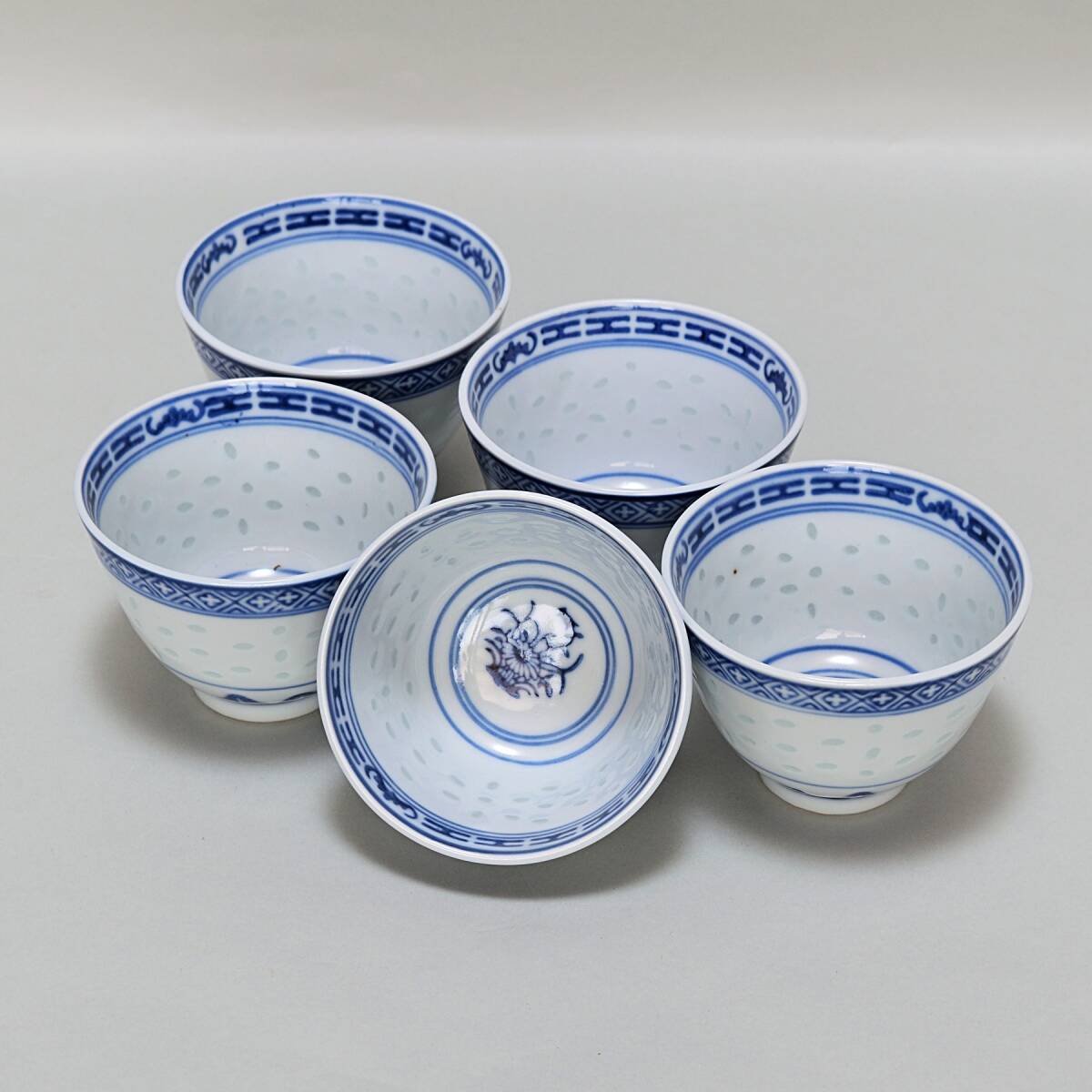 - 未使用 景徳鎮 蛍焼 青花玲瓏 茶器 5客 73mm 箱有