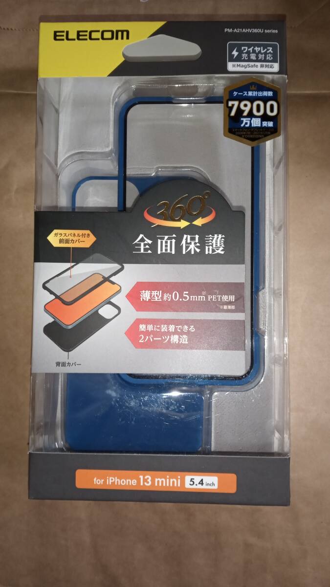 > ELECOM iPhone 13 mini ハイブリッドケース 360度保護 薄型 ブルー 前面強化ガラスと背面・側面PET素材で端末を360度全面保護 定形外290~
