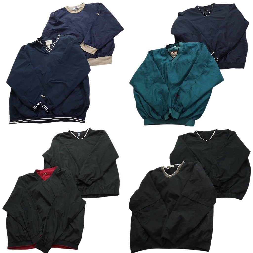 > 古着卸 まとめ売り 無地 ナイロンプルオーバー ジャケット 8枚セット (メンズ XL /2XL ) Vネック 袖ロゴ ブラック 中古 古着 NC1484