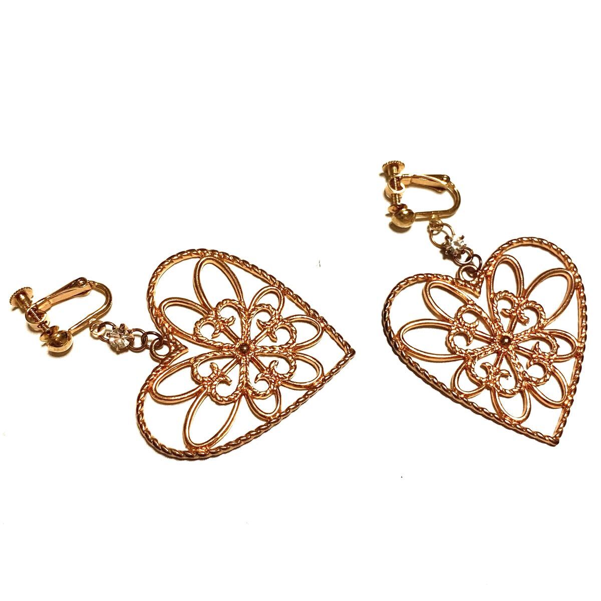 - ハート透かしレースイヤリング ピンクゴールド レースフラワー ストーン アクセサリー ヴィンテージ風 大ぶりイヤリング