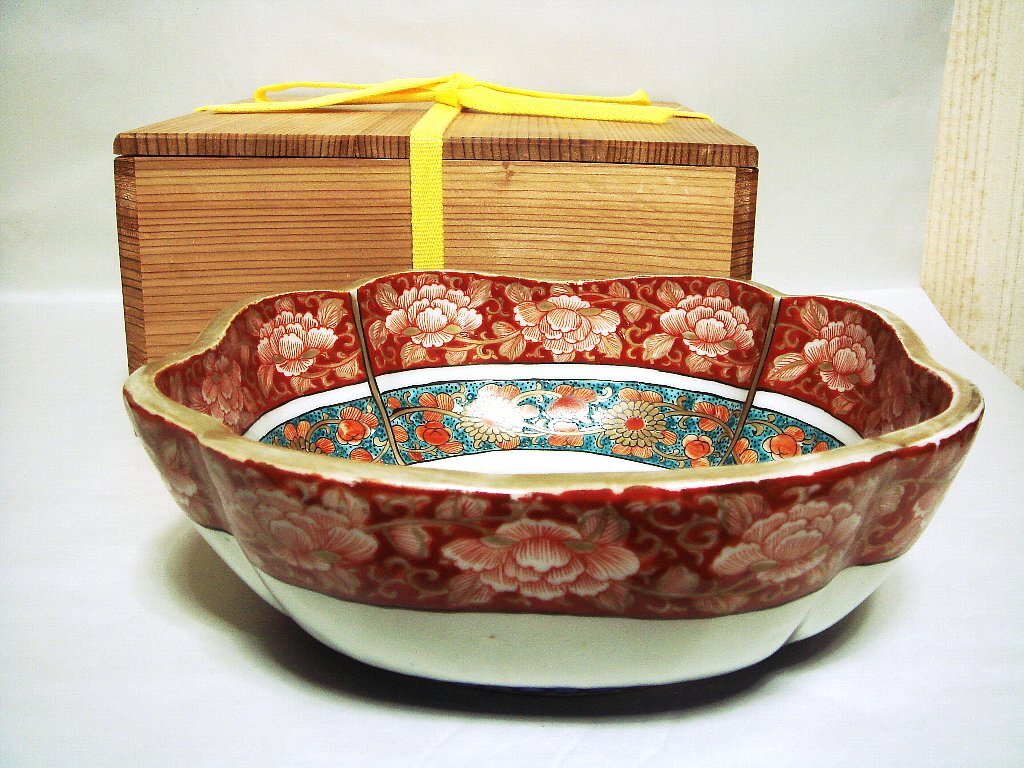 - Y128 赤絵 花唐草文 鉢 箱付き