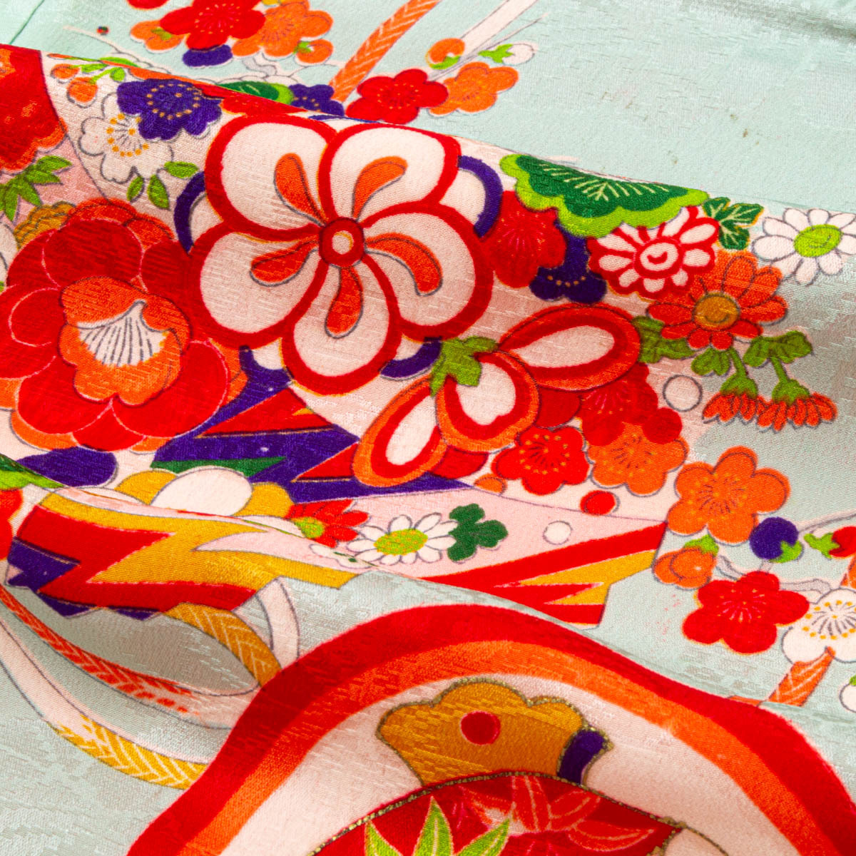 - アンティーク着物 紋綸子 束ね花柄 丸文 ライトブルー マルチカラー 子供用