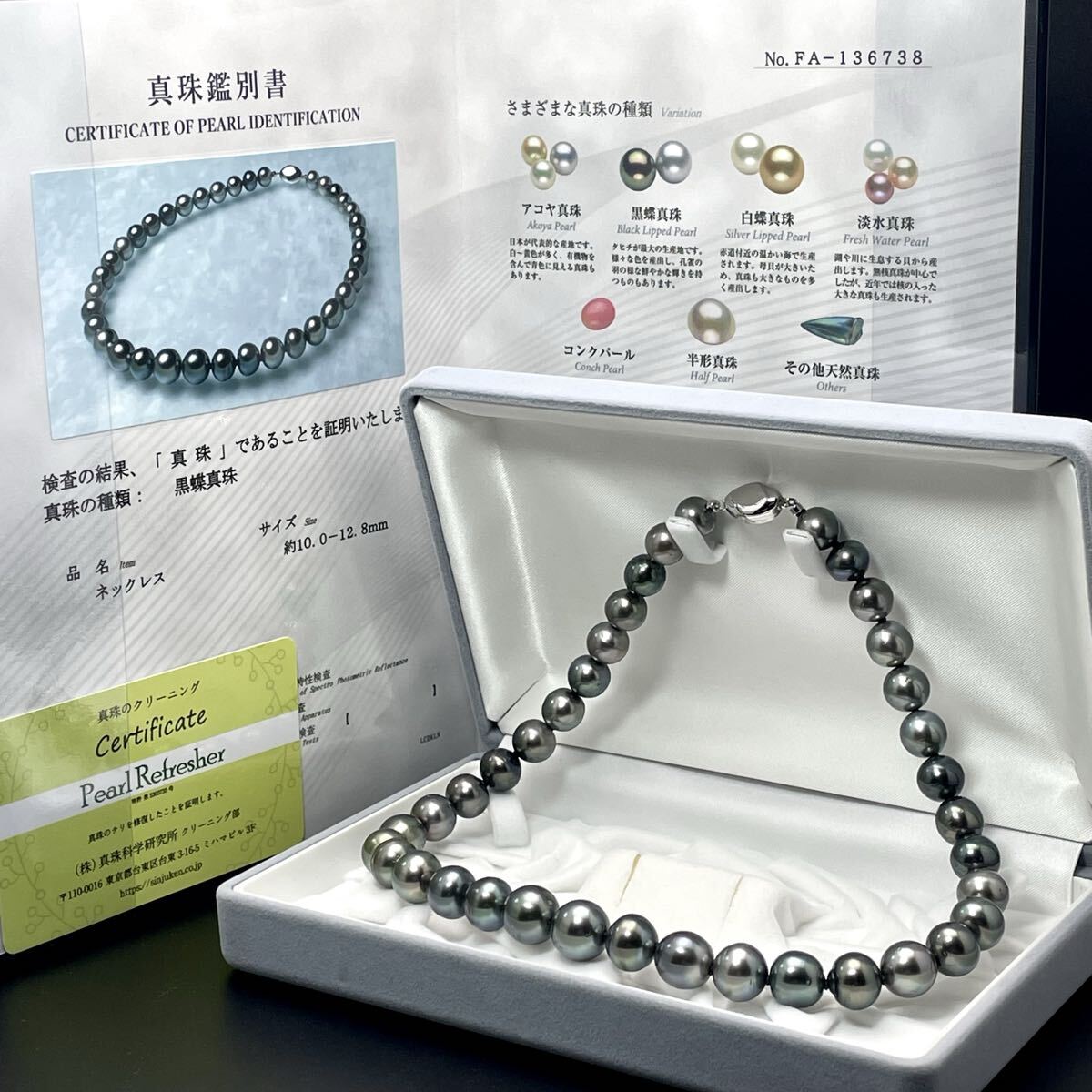 > 【糸替え/クリーニング◎】テリ最強◎オーロラピーコック級 黒蝶真珠/クロチョウ パール ネックレス 10mm-12.8mm 76g 44cm 鑑別書◎ Pearl