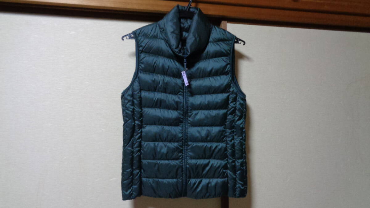 > 送料込み・クリーニング済み ユニクロ ライトダウン 上質 軽量 ダークグリーン系 ダウンベスト S