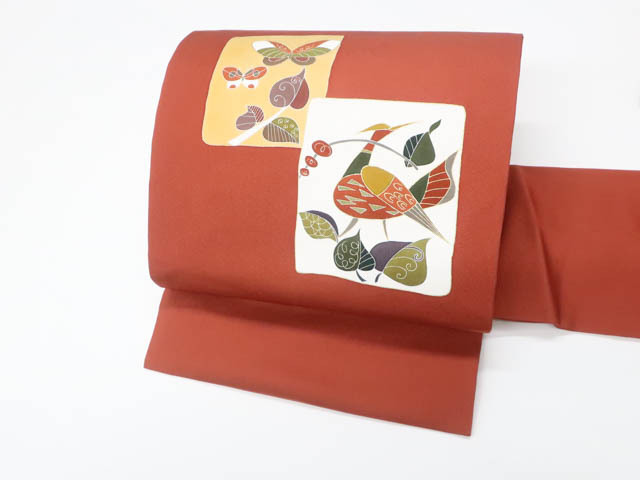 - 《京都一輝堂》リサイクル着物 九寸名古屋帯 太鼓柄 鳥 蝶 正絹 25b09-1691