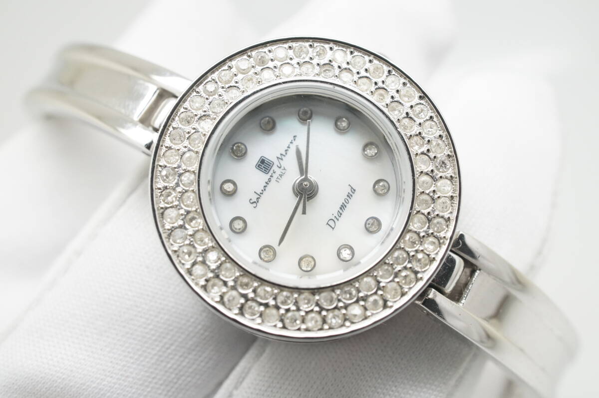 > G70●作動良好 美品 SalvatoreMarra サルバトーレマーラ 天然ダイヤモンド シェル文字盤 レディース腕時計 シルバー お洒落 クォーツ