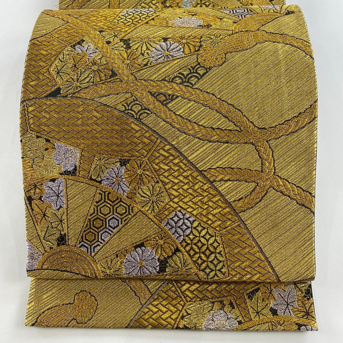 > 【美品】 袋帯 秀品 振袖向き 源氏車 組紐 金銀糸 金色 六通 正絹 【中古】