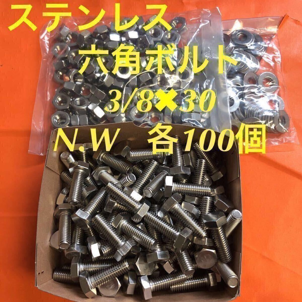 - ★送料込★ステンレス 六角ボルト 3/8×30 ナット・平ワッシャー 各100個 ステン六角ボルト