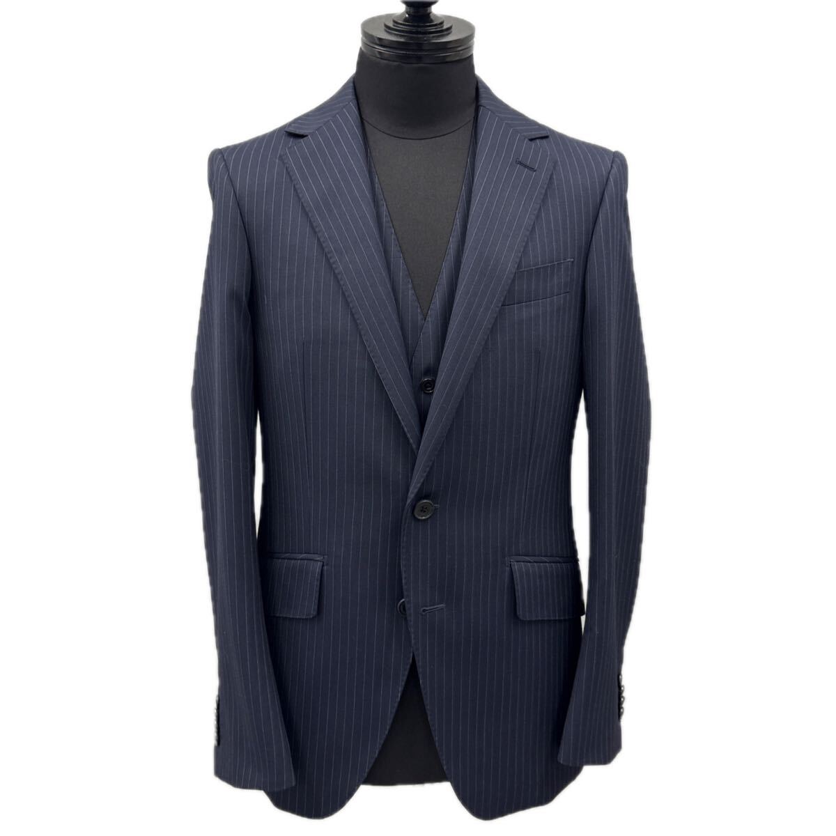 - 試着程度 ネイビーストライプ 3ピーススーツ イージーケアウールポリ サイズ44相当身長172体重63前後
