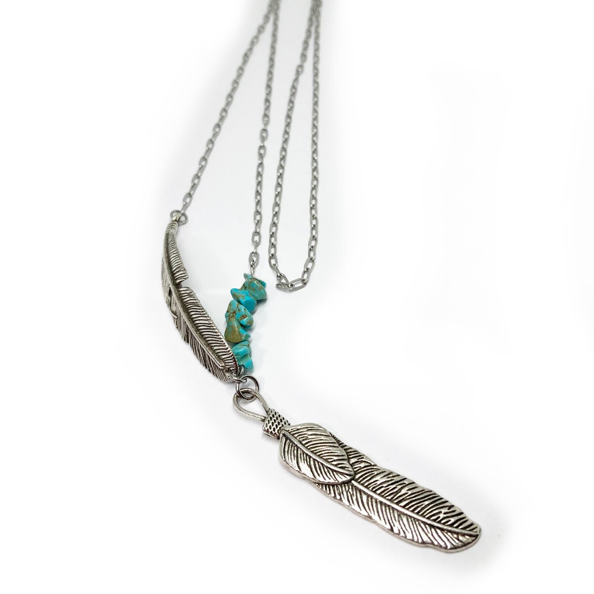 - 男女兼用 フェザーチャーム ロングネックレス 染めターコイズ 約75cm NGF02