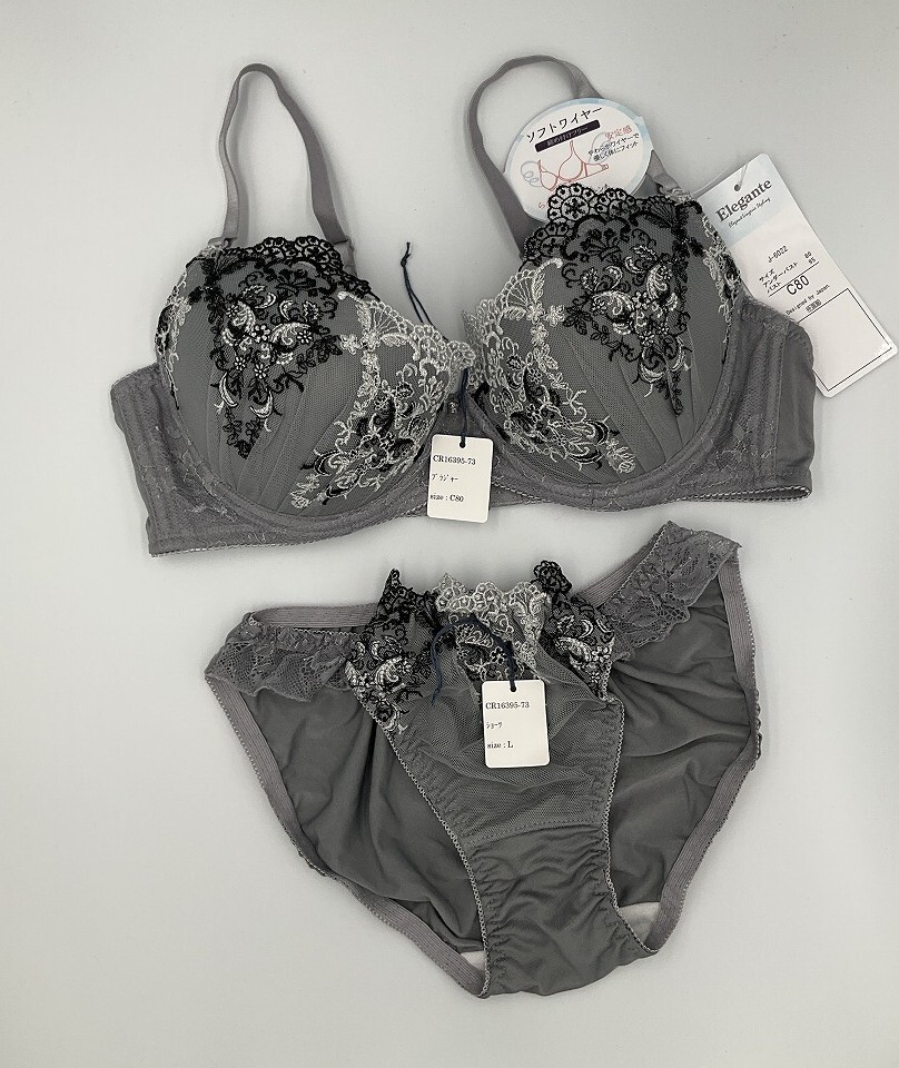 - CR16395-73 IB⑦【特価】新品 ブラショーツセット C80/L グレー レース 花柄 脇高 刺しゅう シフォン 3/4カップ レディース