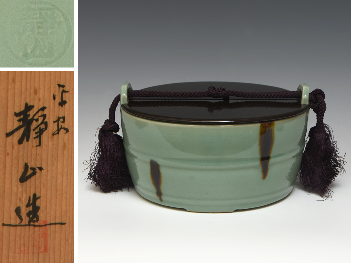 - 平安 富田静山 (造) 飛青磁 鯉桶 水指 誂蓋 共箱 割蓋 京焼 清水焼 茶道具 水屋道具 陶磁器 u1099t