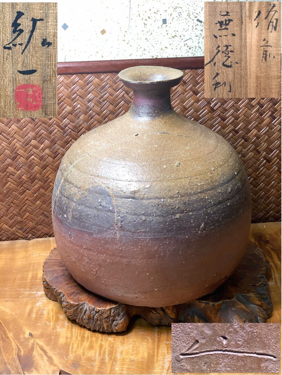 > 時代物 備前焼 備前市指定無形文化財 柴岡紘一 作 蕪徳利 共箱 在銘 良品 華道具 茶道具 花生 花器 和骨董 和美術 煎茶道具 酒器 花入 壷