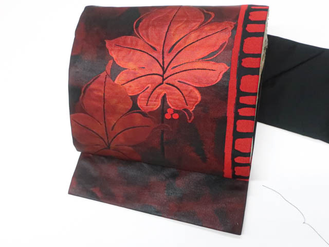 - 《京都一輝堂》リサイクル着物 九寸名古屋帯 太鼓柄 葉 正絹 25b08-1384